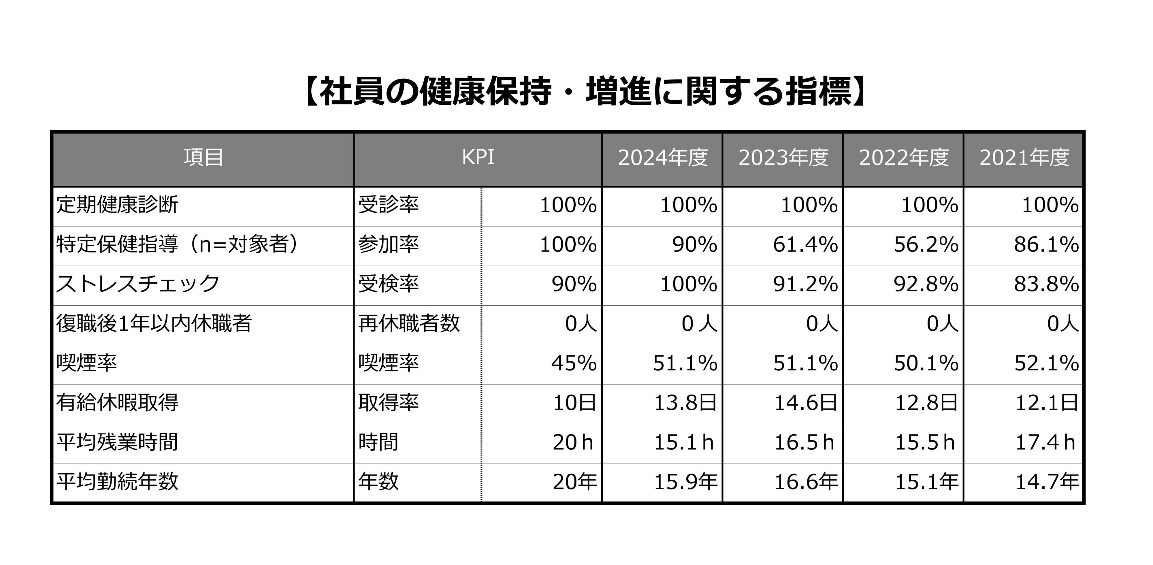 当社は、会社の成長を支える社員とその家族の心身の健康を重要な経営資源と捉え、健康維持・増進活動を積極的に行います。社員とその家族がのびのびと豊かで快適な社会生活を送り、かつ経済の発展に貢献する会社を目指します。