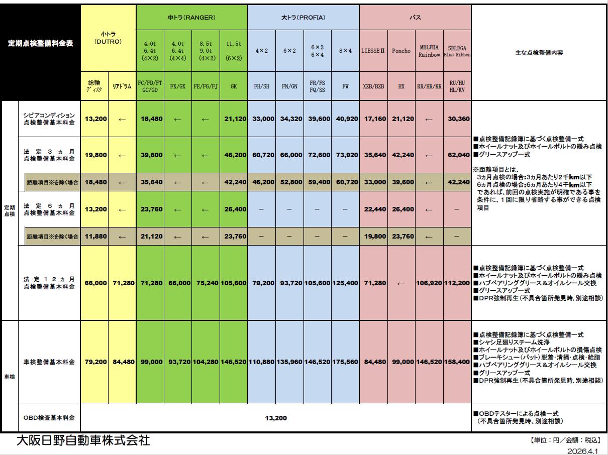 整備料金価格表 価格表に掲載のない作業につきましては、お気軽にお問い合わせください。 車種・状態などにより価格が変動する場合があります。詳しくは最寄りの支店までお問い合わせください。 ※クリックすると拡大します